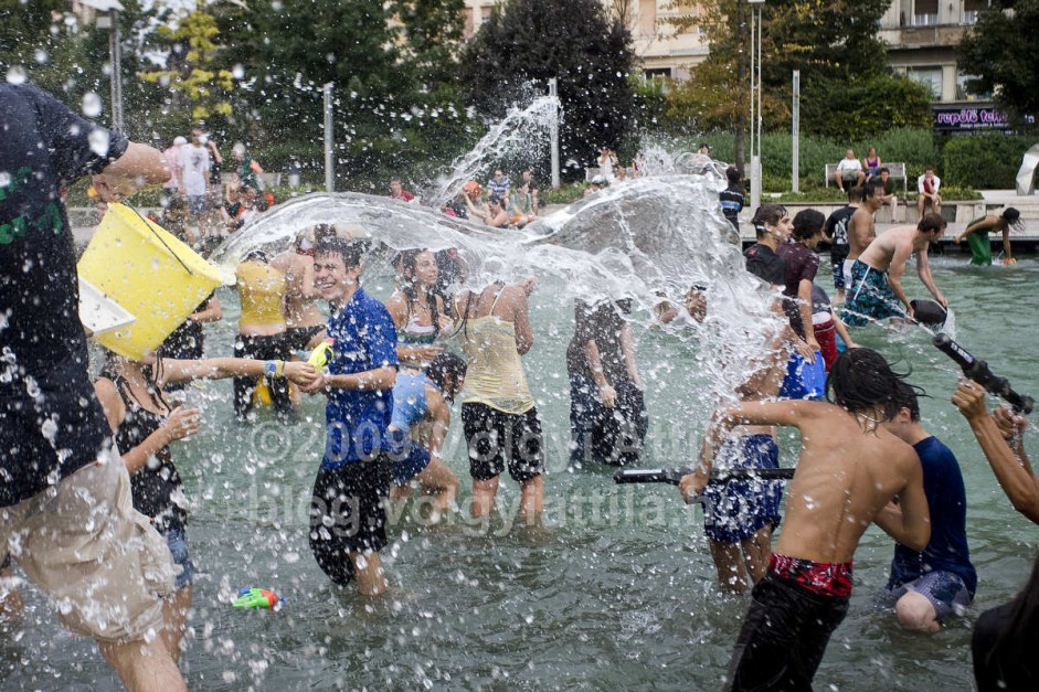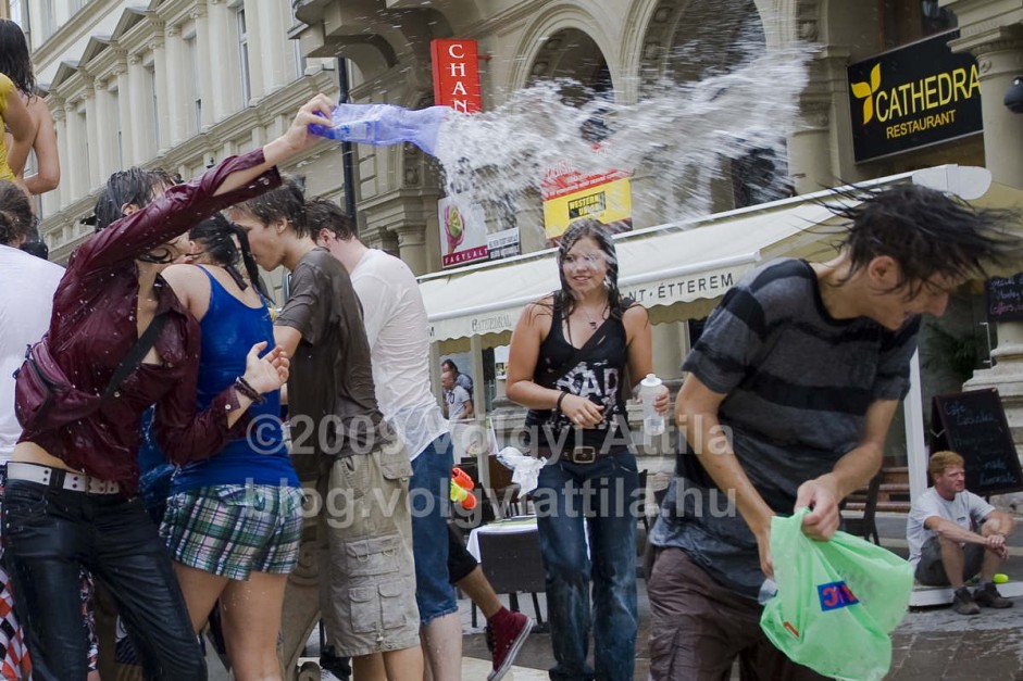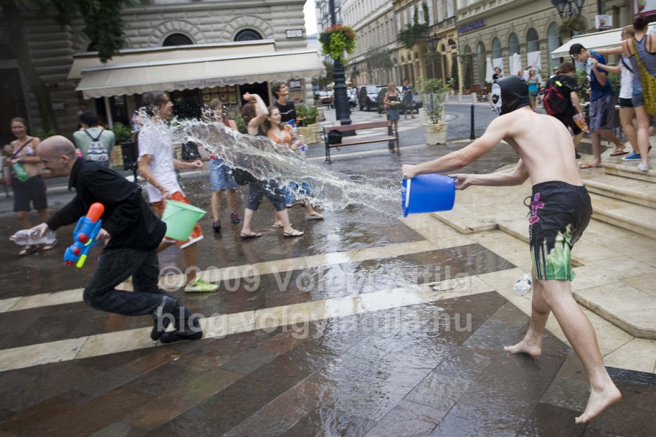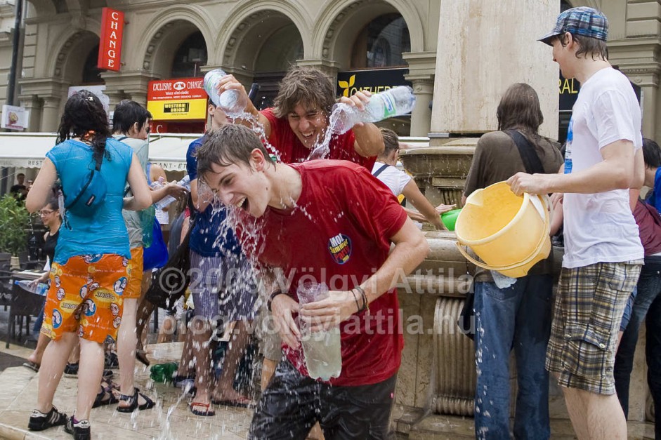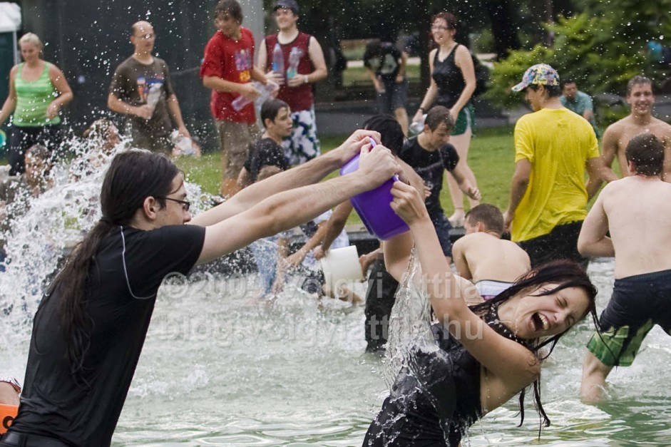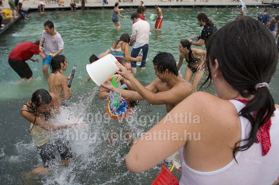 Résztvevők locsolják egymást a mesterséges tó vizével az Erzsébet téri Gödör Klubnál zajló köztéri vizicsatán Budapest belvárosában miután a Bazilikától átvonultak az új helyszínre. Magyarország. 2009. augusztus 22.
