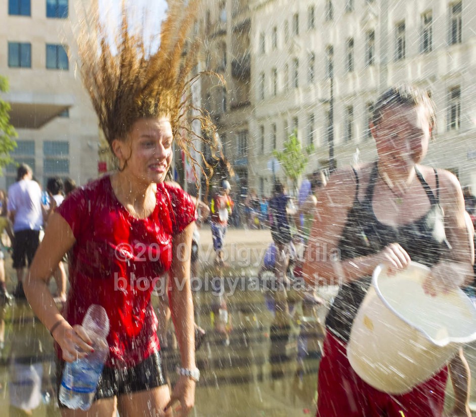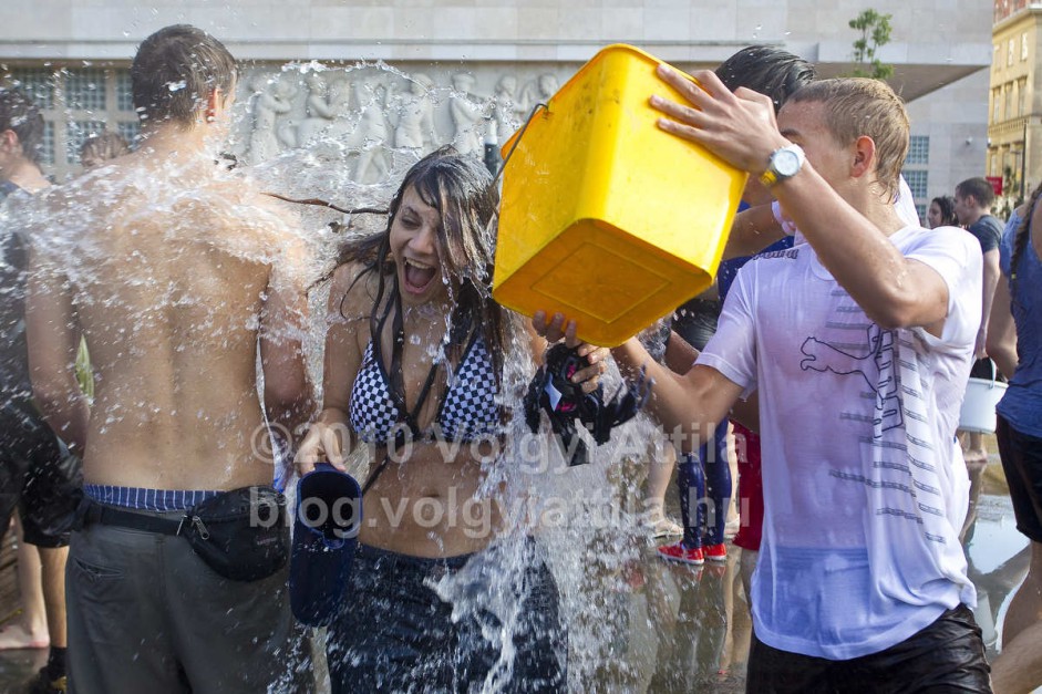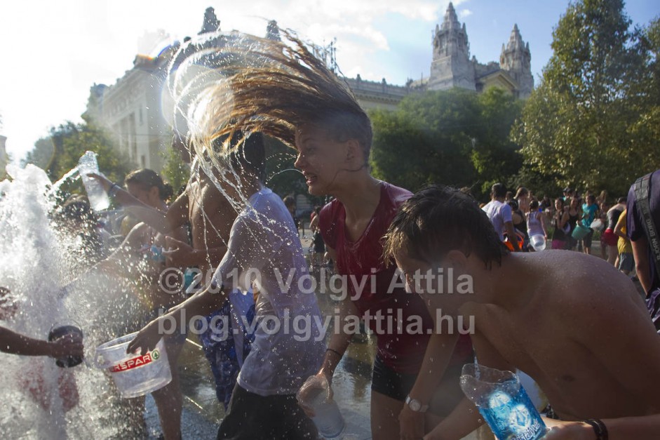 Fiatalok fröcskölik egymást egy köztéri vizicsatában a Szabadság téri szökőkútnál.