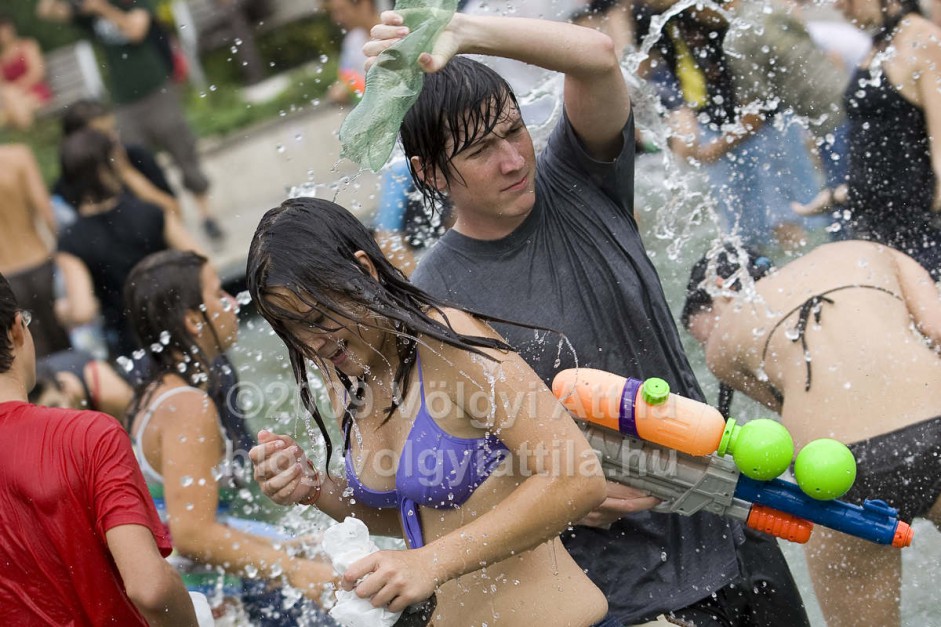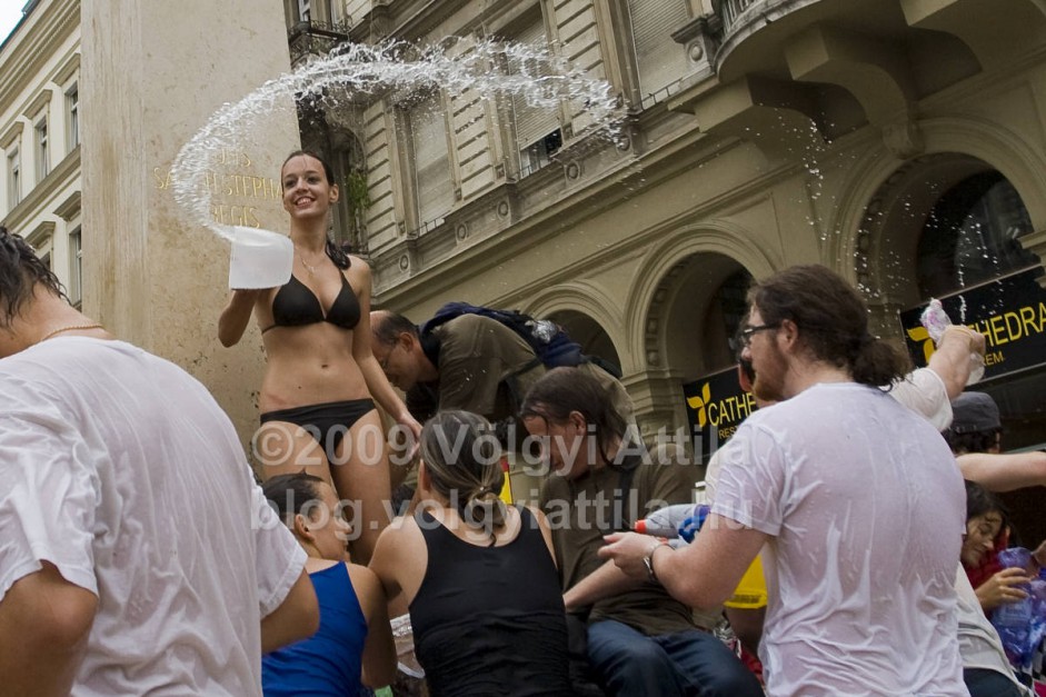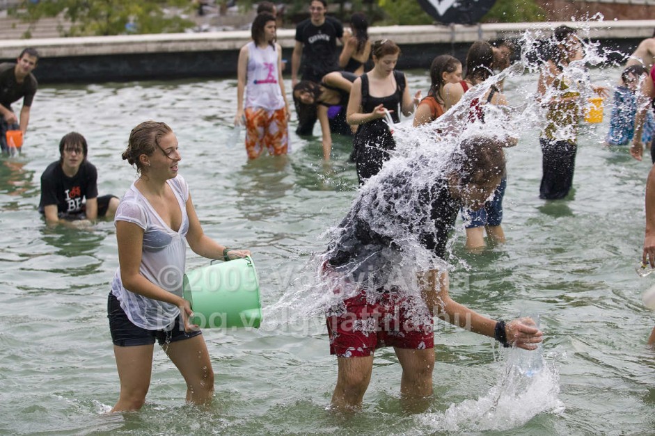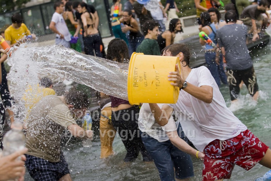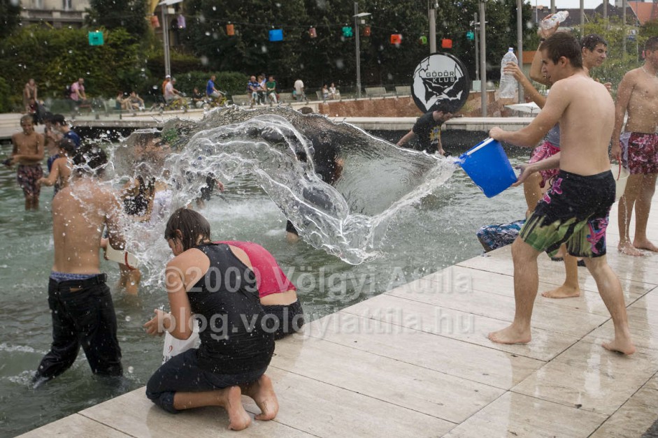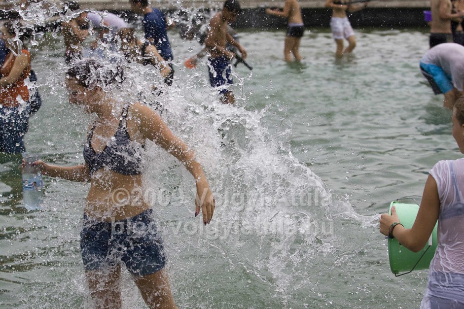 Résztvevők locsolják egymást a mesterséges tó vizével az Erzsébet téri Gödör Klubnál zajló köztéri vizicsatán Budapest belvárosában miután a Bazilikától átvonultak az új helyszínre. Magyarország. 2009. augusztus 22.