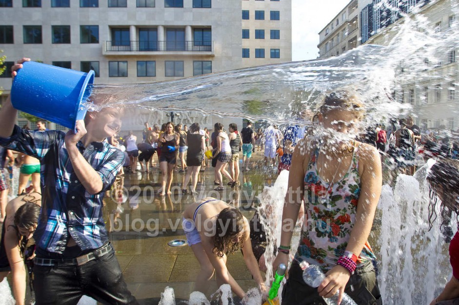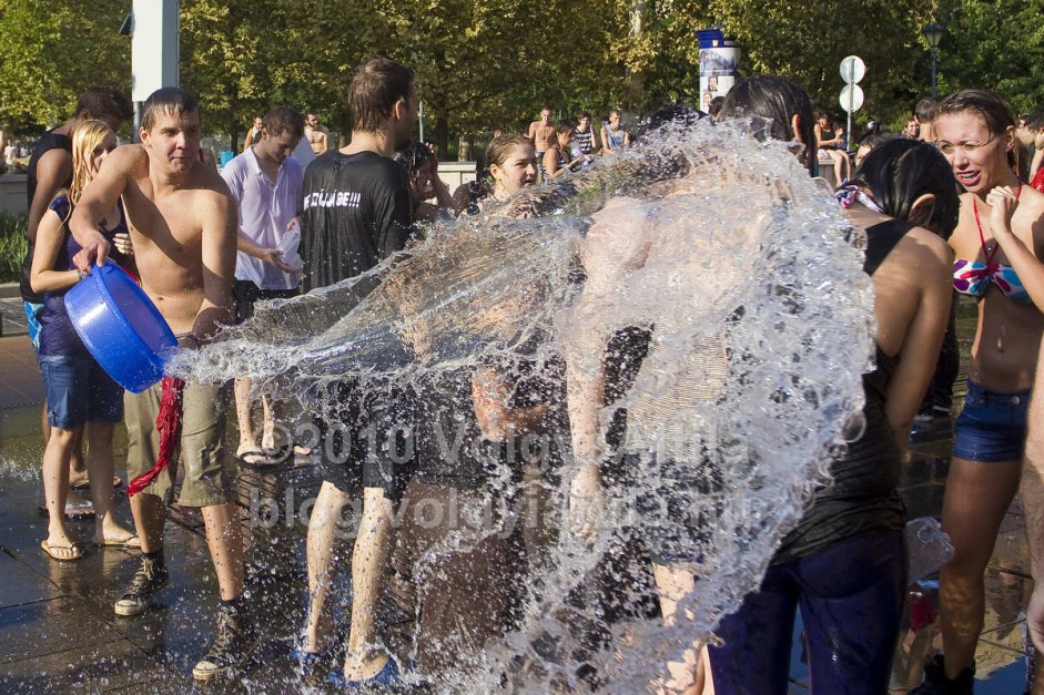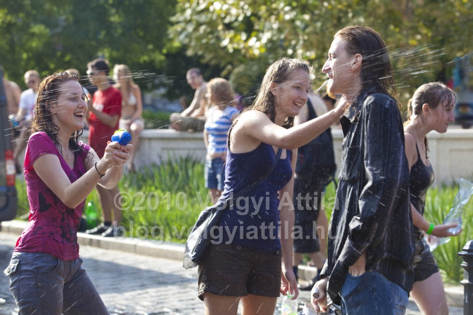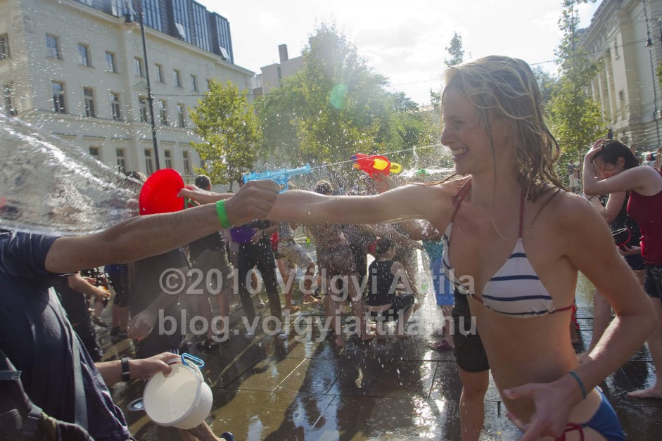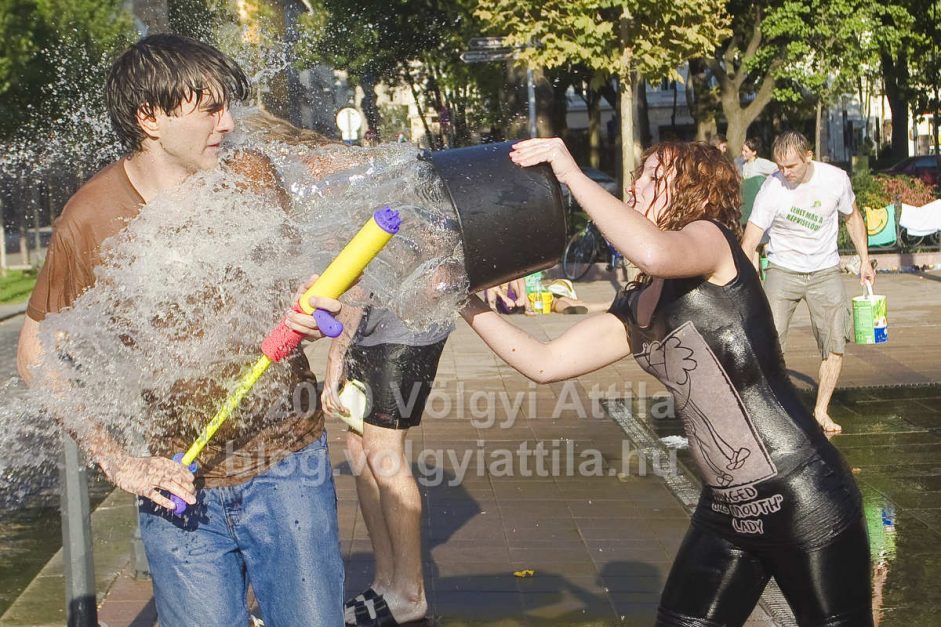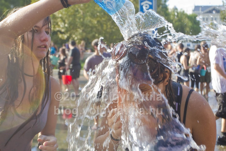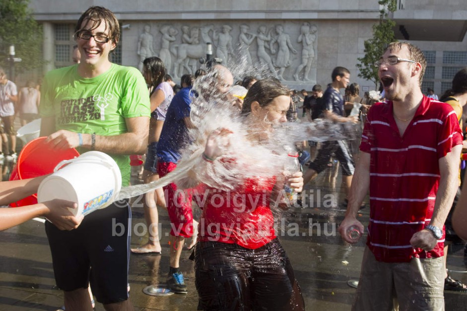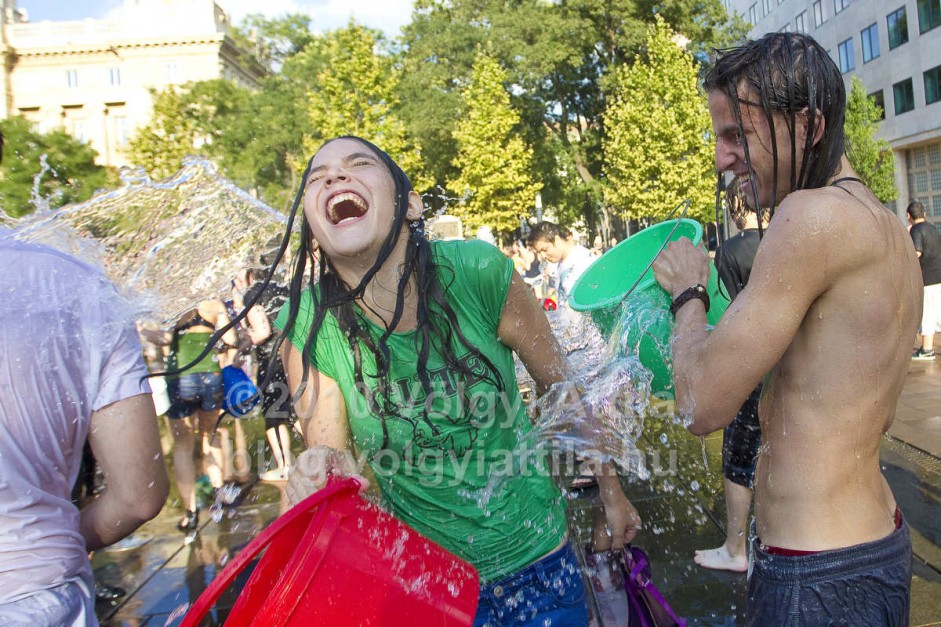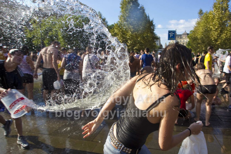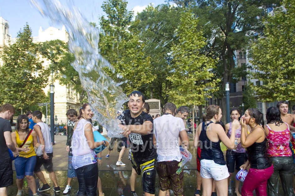 Fiatalok fröcskölik egymást egy köztéri vizicsatában a Szabadság téri szökőkútnál.
