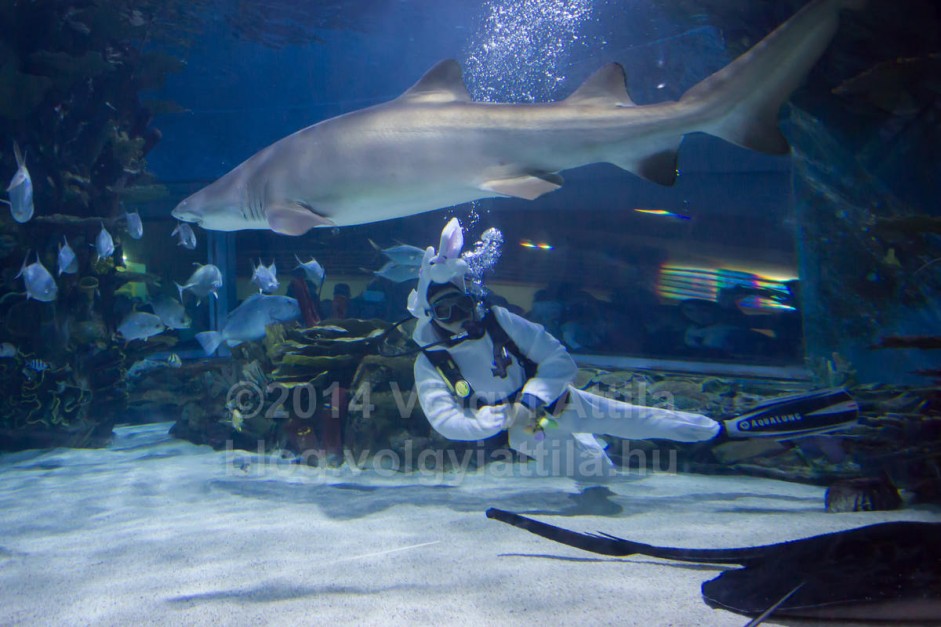 A cápás állatkert legújabb hagyománya a húsvéti nyúlnak öltözött búvár merülése a cápák között.