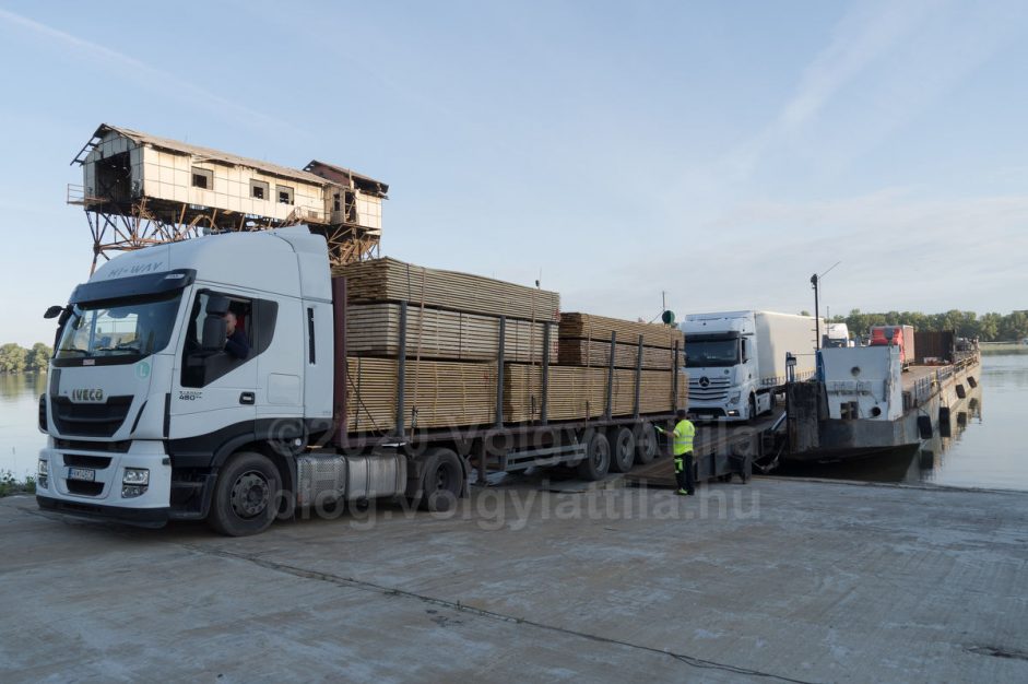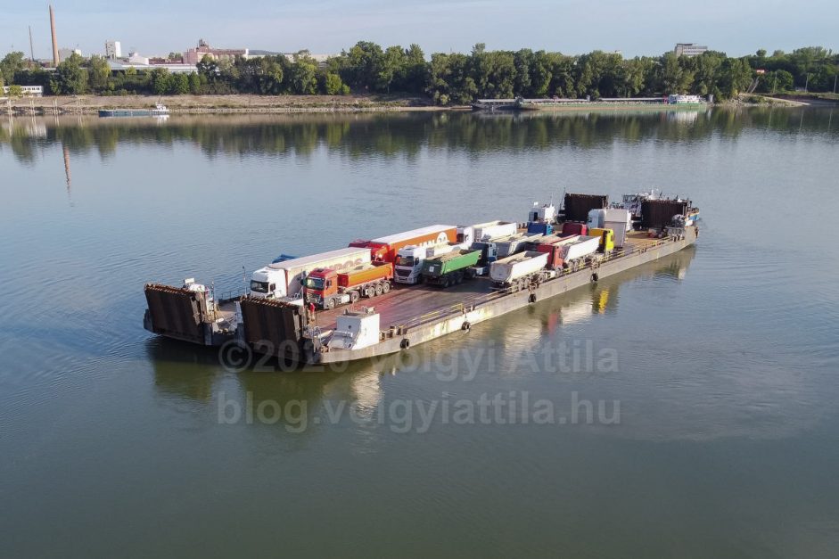 Teherkomp szállítja a kamionokat a Dunán a Szlovákia és Magyarország közötti határon húzódó Duna szakaszon