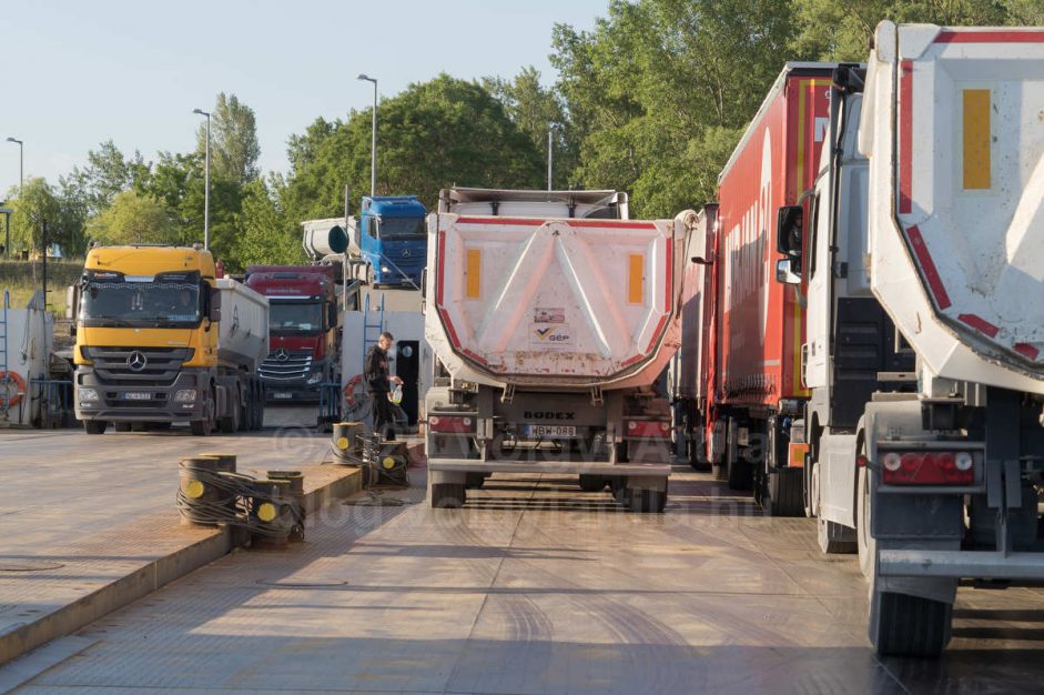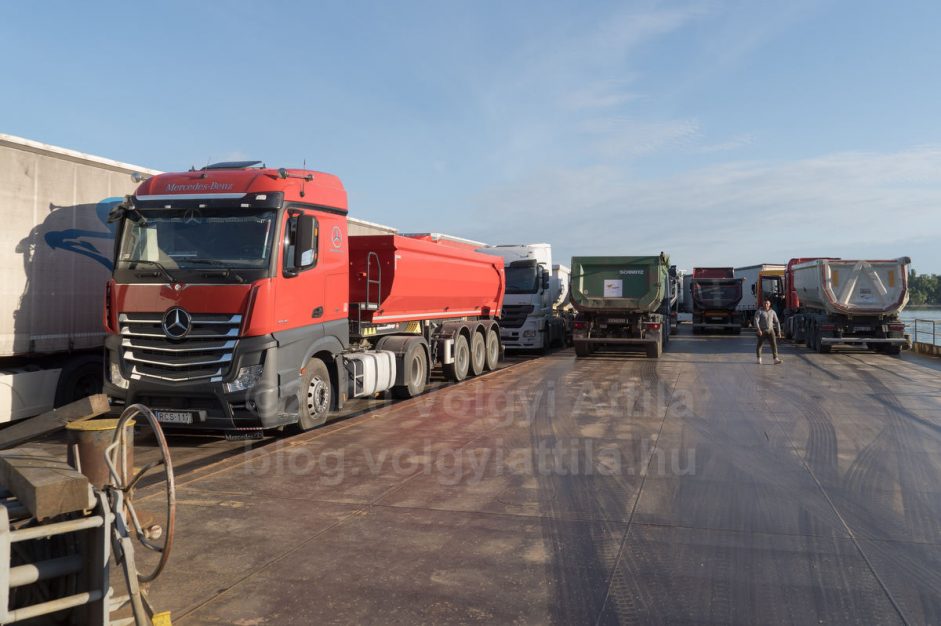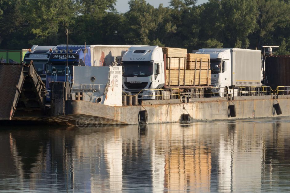 Teherkomp szállítja a kamionokat a Dunán a Szlovákia és Magyarország közötti határon húzódó Duna szakaszon.