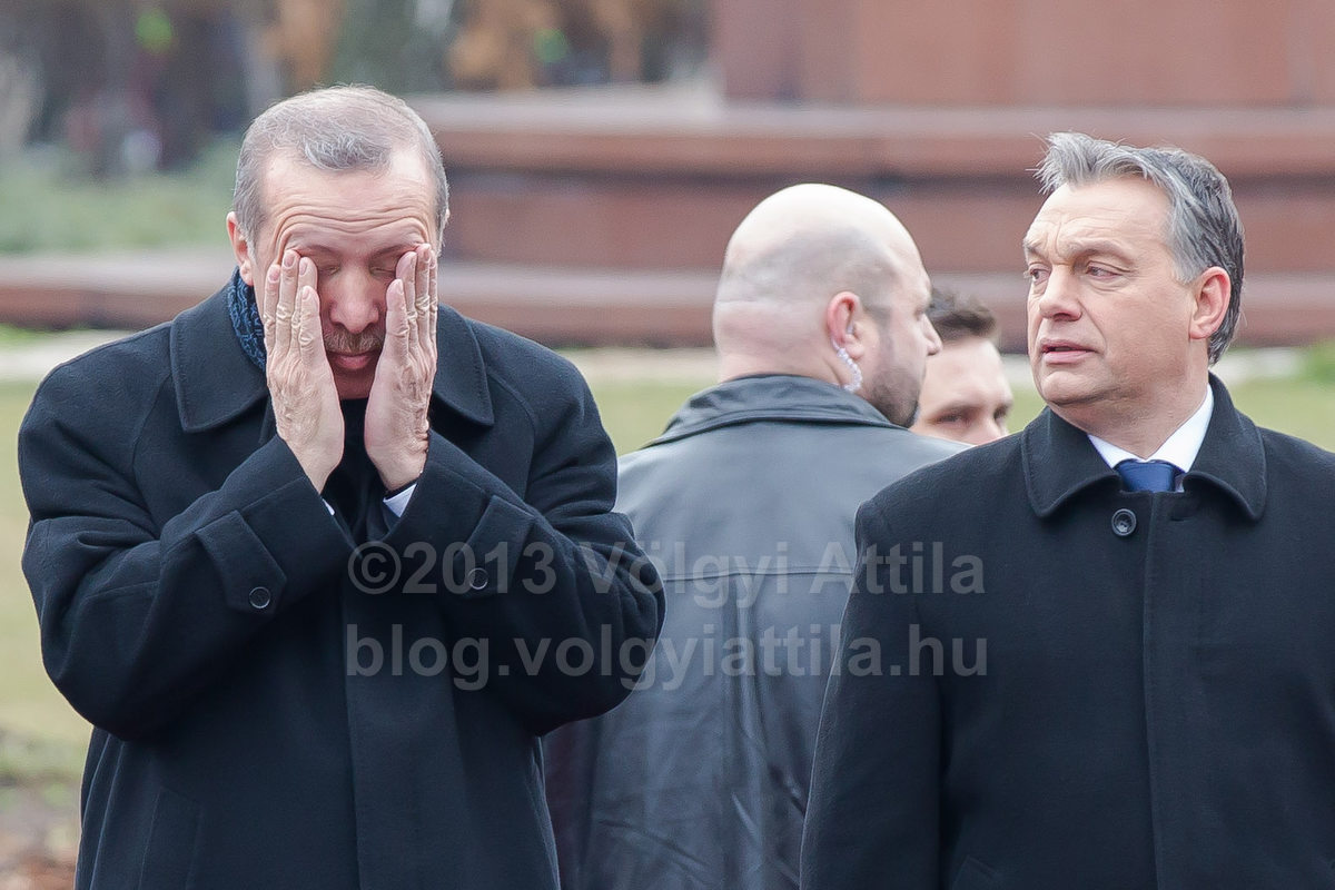 A török elnök, Recep Tayyip Erdogan (balra) és vendéglátója Orbán Viktor (jobbra) magyar miniszterelnök megtekintik a díszőrséget egy fogadási ünnepség keretében a Parlament előtt, Budapesten. 2013. február 05.