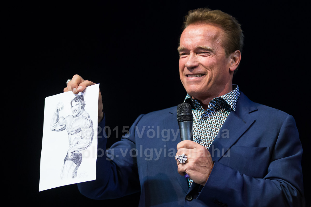 Arnold Schwarzenegger, amerikai színész és volt californiai kormányzó mutat egy őt ábrázoló rajzot, amire autogramot kértek tőle a Siker Napja rendezvényen a budapesti Papp László Sportarénában. 2015. február 22.