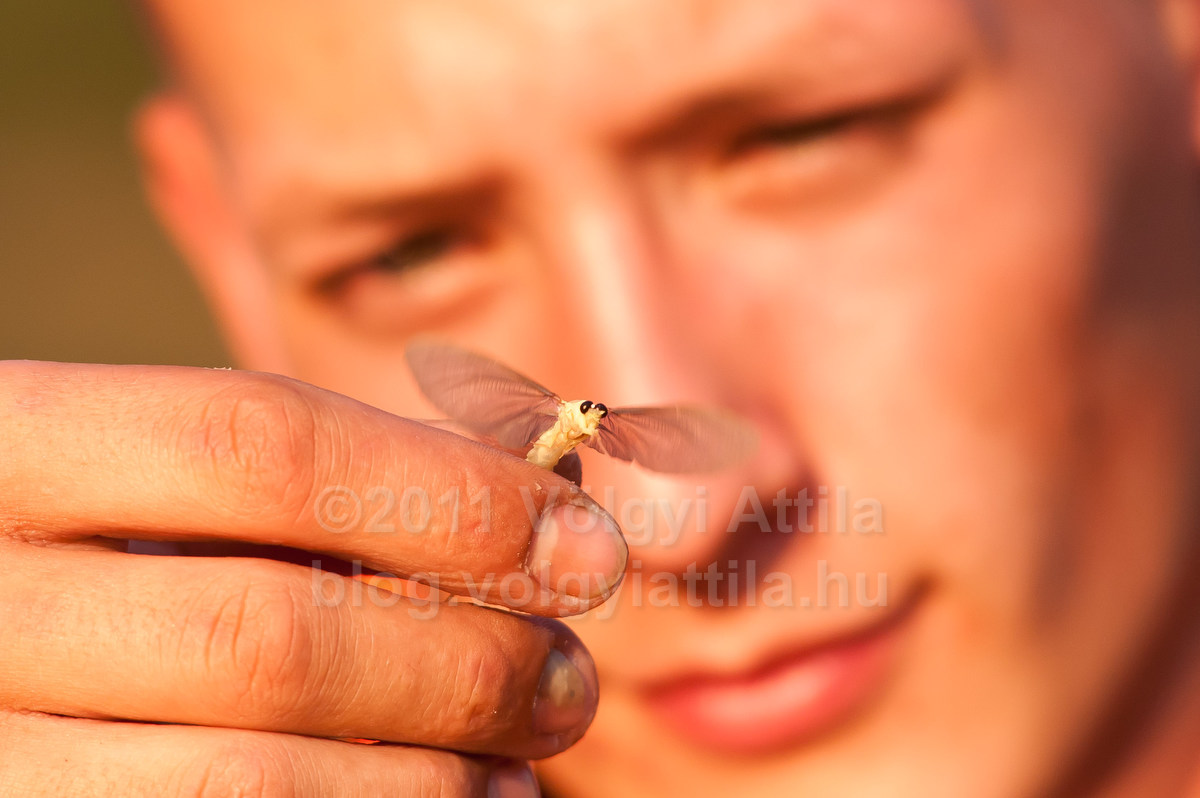 Helyi férfi tart kezében egy tiszavirágot (Palingenia longicauda) a kérészek “tiszavirágzás” néven ismert rajzása során a Tiszán, Tiszainoka közelében. 2011. június 12.