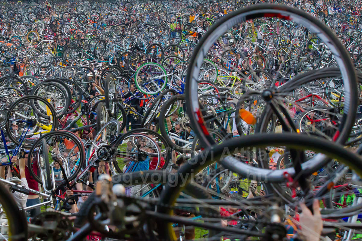Több ezer résztvevő emeli magasba bringáját a Critical Mass kerékpáros felvonulás végén a városligeti napozóréten 2013. április 20.