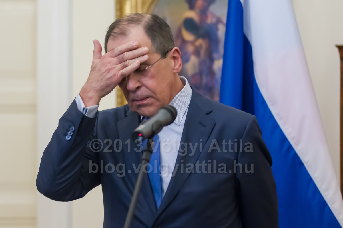 Sergei Lavrov orosz külügyminiszter beszél egy sajtótájékoztatón budapesti látogatása során a Külügyminisztériumban. 2013. május 2.