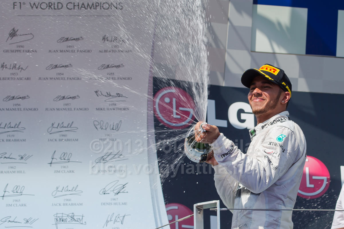 A Petronas Mercedes Forma1 brit pilótája Lewis Hamilton ünnepli győzelmét a Magyar Nagydíj után a mogyoródi Hungaroringen 2013. július 28.