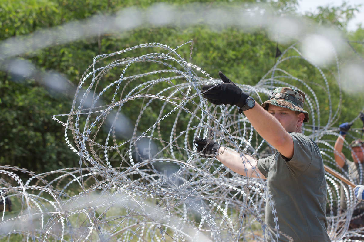 Magyar katonák építenek egy minta részletet a Szerbia és Magyarország határára az illegális migráció ellen tervezett határkerítésből Mórahalom közelében. 2015. július 16.