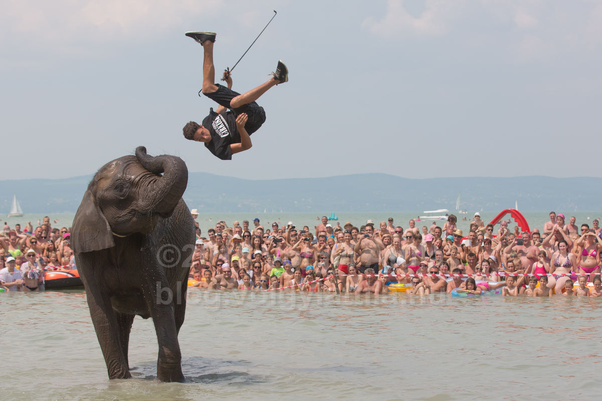 Az ifjabb Rene Caselly német cirkusz artista szaltózik a Balatonban álló elefánt hátáról a Cirkuszok Éjszakája promóciós rendezvényén a Balatonlellei Napfény strandon. 2015. július 18.