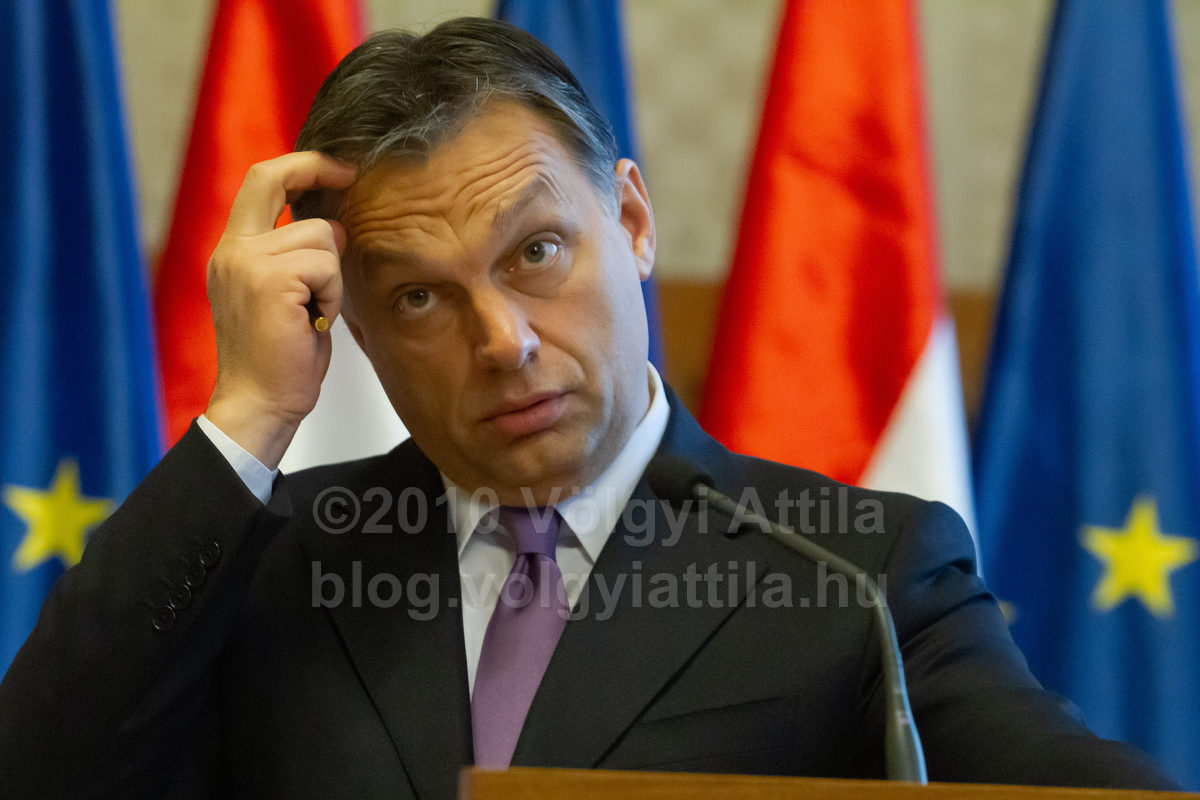 Orbán Viktor magyar miniszterelnök beszél egy az Európa Tanács elnökével, Herman Van Rompuy-jal közösen tartott sajtótájékoztatón. Budapest, Hungary. 2010. december 21.