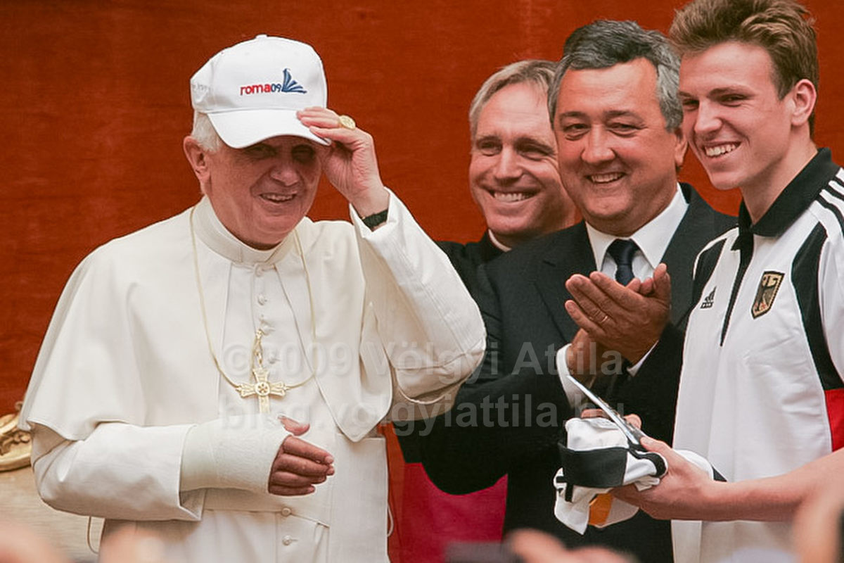 XVI. Benedek pápa a Római Úszó VB rerklámsapkájával pózol a Castel Gandolfo-i nyári rezidenciáján. 2009. augusztus 1.