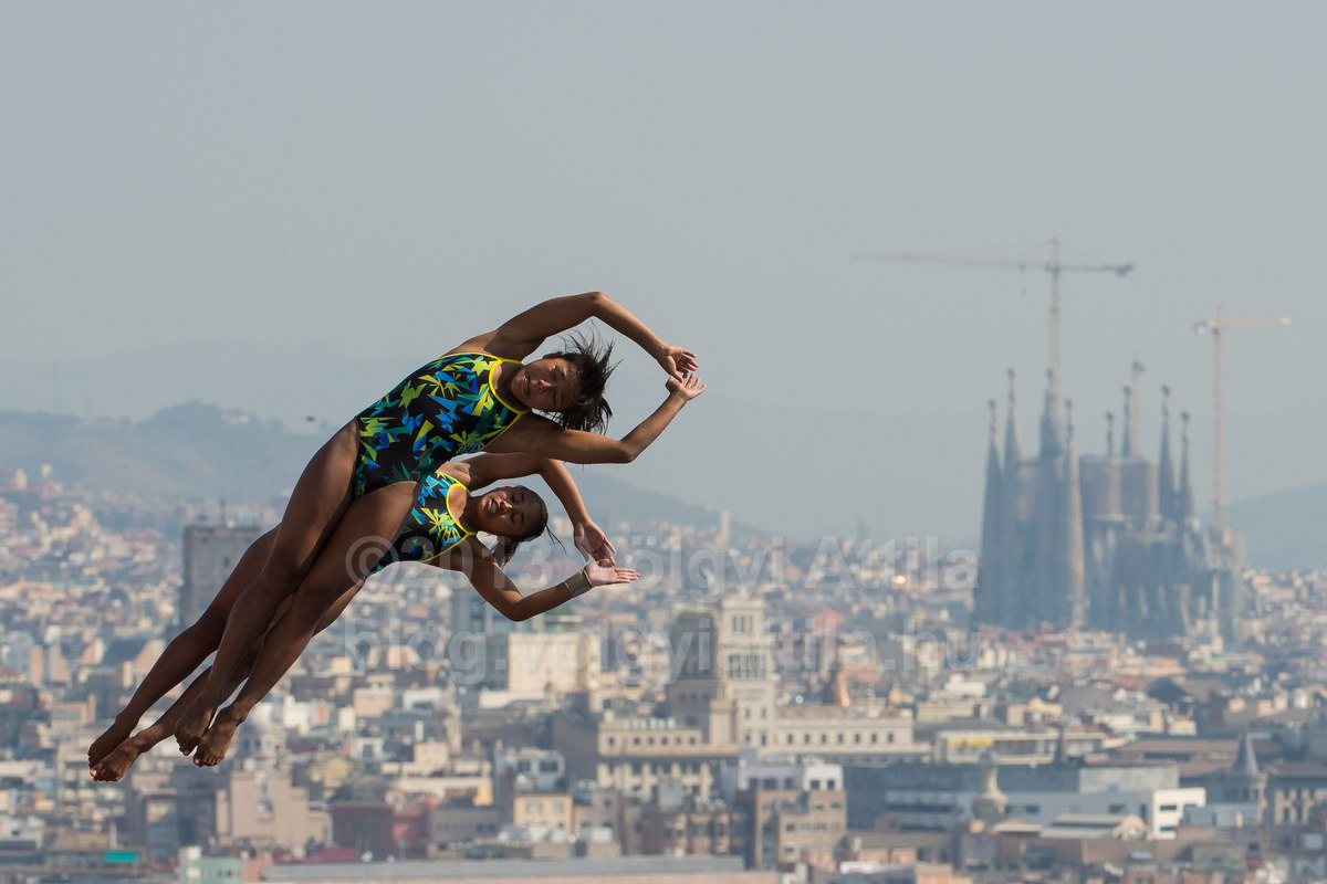 Az indiai Dewi Setyaningsih és Linadini Yasmin párosa versenyez a Barcelonában megrendezett FINA Úszó Világbajnokság 10 méteres szinkron toronyugró selejtezőjében 2013. július 22.