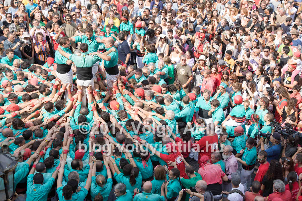 Helyiek embertorony építő versenye a Merce Fesztivál során a barcelonai városháza épülete előtti téren. 2017. szeptember 23.