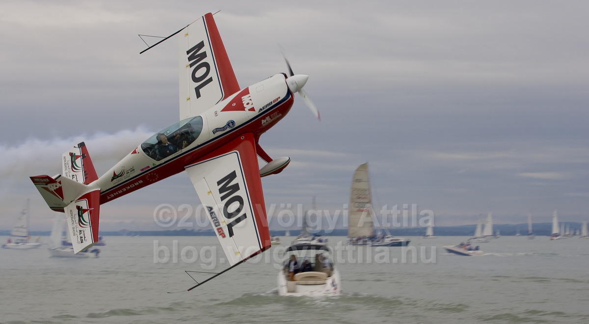 Veres Zoltán műrepülő pilóta látványos bemutatója nyitja a 40. Kékszalag vitorlásversenyt Balatonfüreden. 2008. június 11.