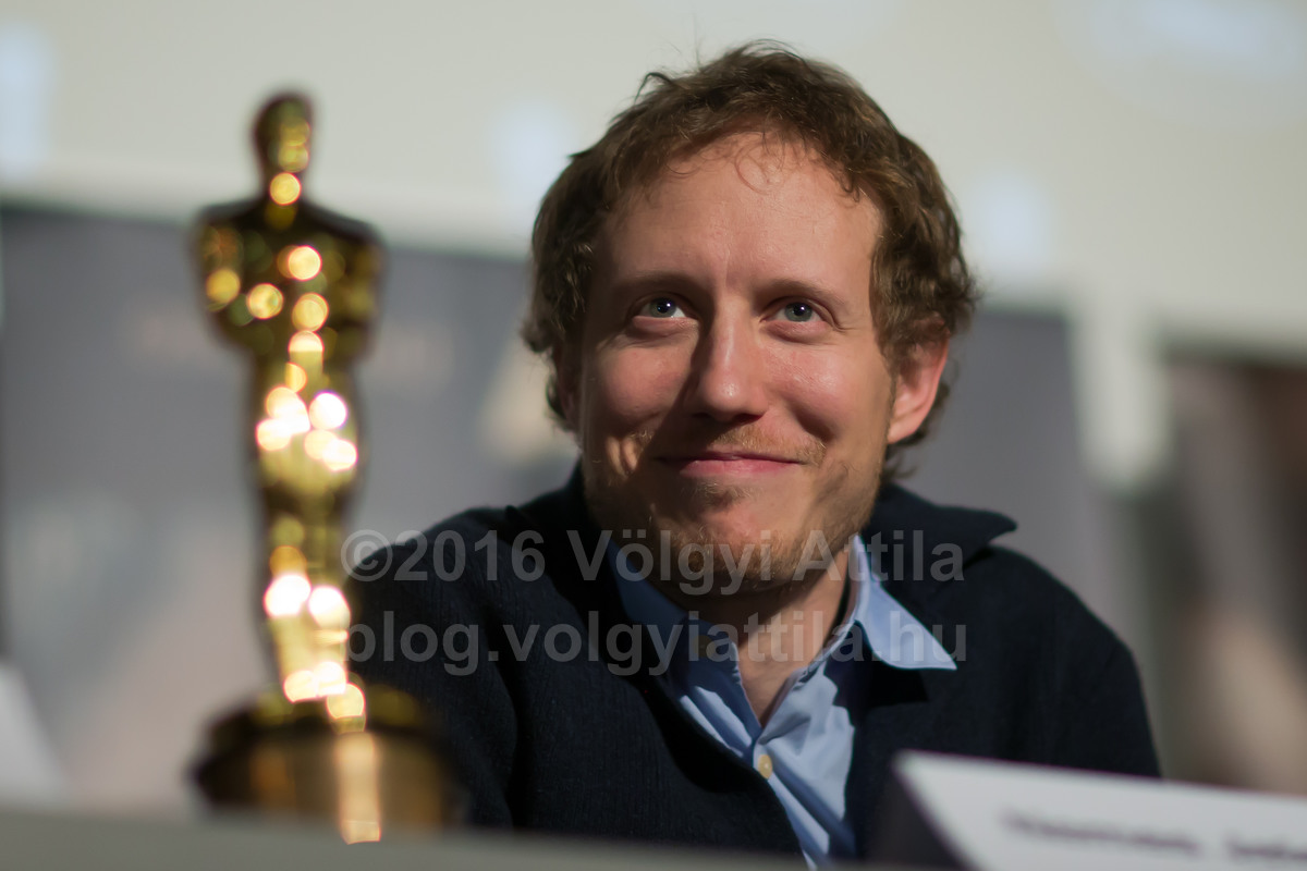 Nemes Jeles László magyar filmrendező látható a “Saul Fia” című filmjével frisen nyert Oscar szobor társaságában beszél egy budapesti sajtótájékoztatón. 2016. március 2.