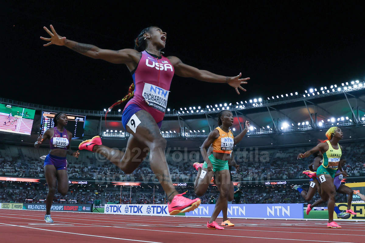 Az amerikai Sha’Carri Richardson (elől) ünnepelve áthalad a célvonalon a budapesti rendezésű Atlétika Világbajnokság Női 100 méteres döntőjében, 2023. augusztus 21-én.