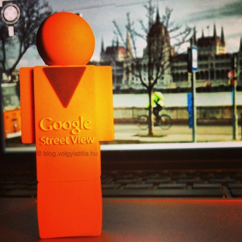 Igen, ez egy kicsi, sárga Google Street View logó formájú pendrive a képen – ami a laptopon áll a képernyőt kitöltő Street View képernyő előtt.